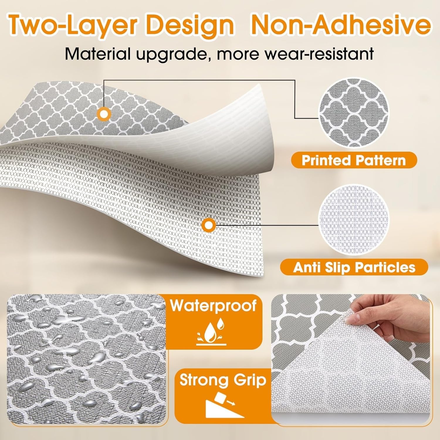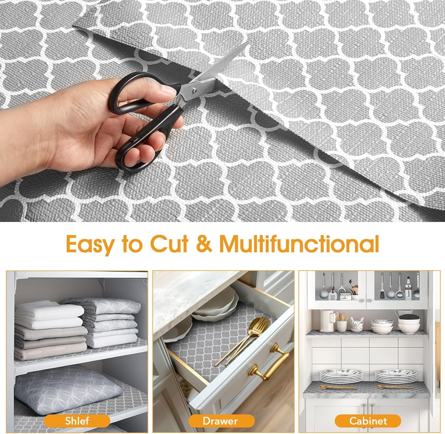 Strong Grip & Non-Slip Design : Dual-sided non-slip shelf liner stays firmly in place—one side grips shelves or drawers, while the other prevents dishes, glassware, and cutlery from sliding. Ideal for protecting fragile items. Surface Protection – Scratch & Spill Resistant : This waterproof and oil-resistant cabinet liner protects shelves and drawers from scratches, stains, and daily wear. No more marks or messes—perfect for kitchen cabinets and cupboards. Easy to Cut, Use & Clean : Non-adhesive and reusable. Just measure, cut to fit, and place. When dirty, wipe clean with a damp cloth—no fuss, no residue. A perfect hassle-free drawer liner. Thick, Durable & Safe Material : Made from thick, BPA-free PVC material, this shelf liner is built to last. It won’t curl or tear easily and helps reduce noise from moving objects in drawers or on shelves. Multi-Purpose Shelf Liner for Every Space : Versatile use as a drawer liner, cupboard mat, desk protector, or fridge liner. Suitable for kitchen, bathroom, office, and more. Keeps surfaces clean, neat, and protected.
