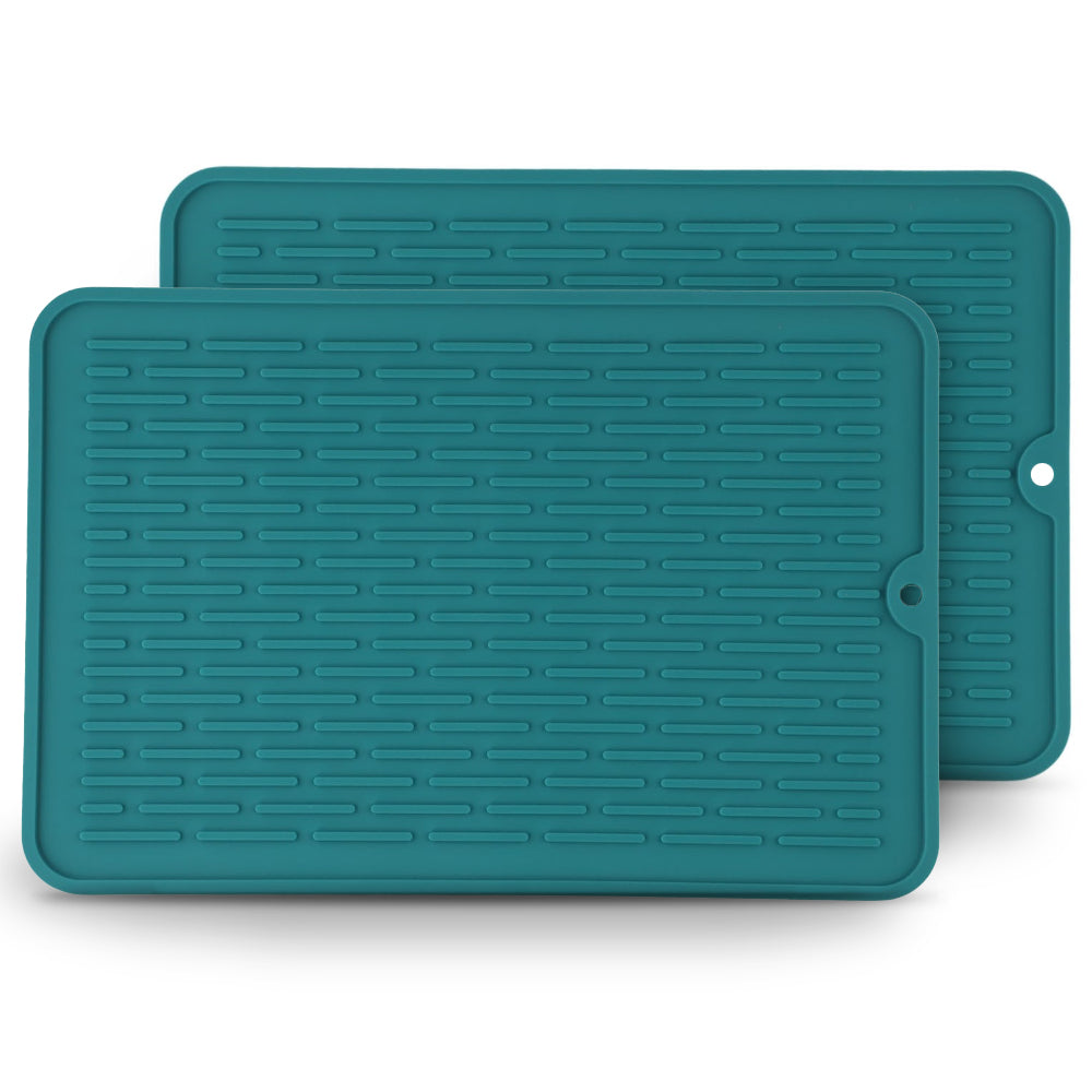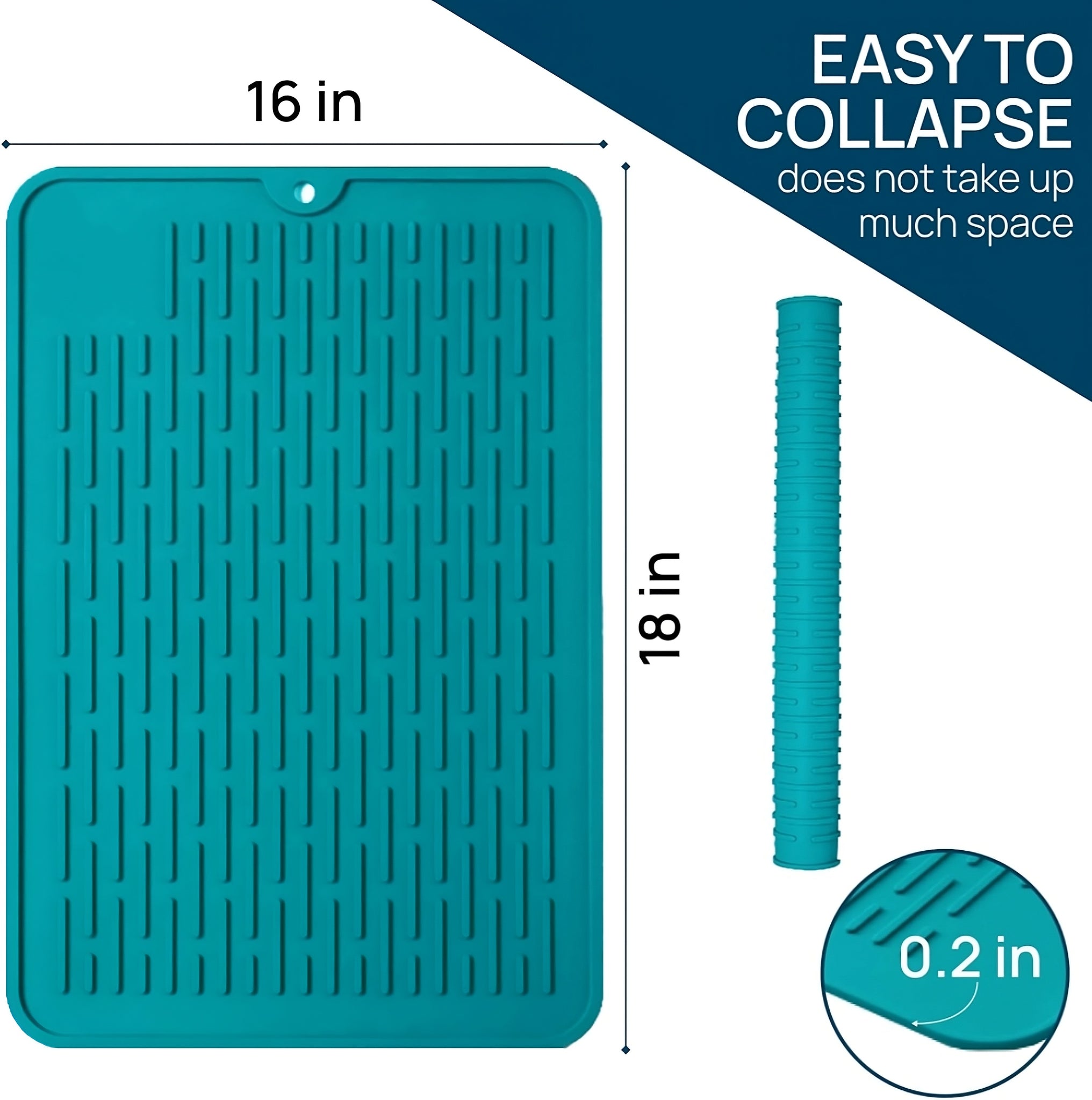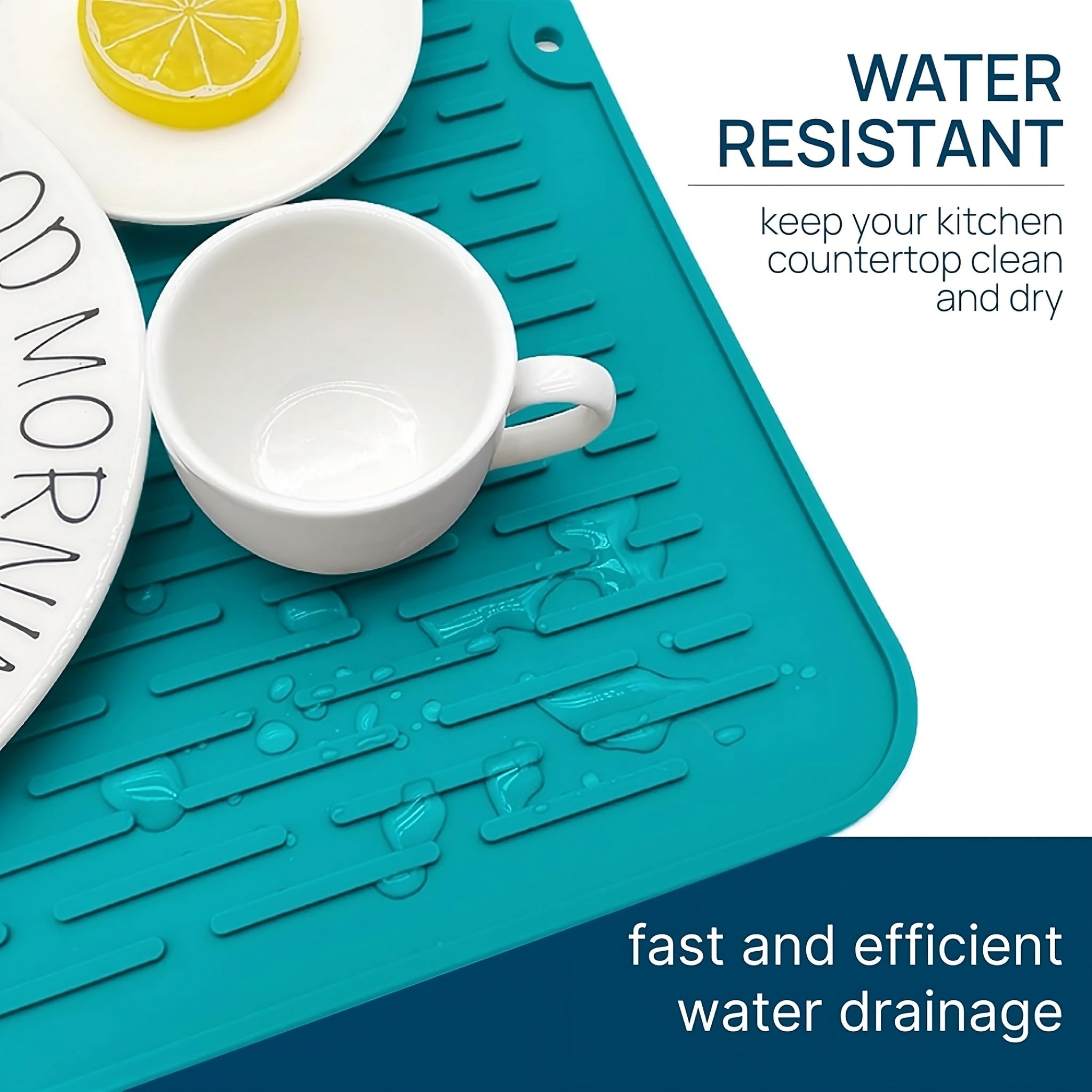 Unique Design: Made from premium food-grade silicone, this dish drying mat is safe and hygienic for drying your dishes. The wide, raised ridges promote better airflow, allowing dishes to dry faster while water evaporates quickly, keeping your kitchen clean and sanitary. Generous Size: Measuring 11.8” x 7.87”, this large drying pad provides ample space to hold pans, pots, kitchen utensils, and even dish racks. Say goodbye to messes and spills with plenty of room for all your drying needs. Versatile Countertop Protector: More than just a drying mat, it doubles as a prep area, pot holder, trivet mat, or dish rack base. It’s heat-resistant up to 230°C (446°F), making it perfect for placing hot pans, kettles, or cookware safely on your countertop. Durable Food-Grade Silicone: Crafted from flexible, durable, and foldable silicone, this mat maintains its shape without deforming. It withstands temperatures from -40°F to 446°F (-40°C to 230°C), making it ideal for protecting surfaces and collecting spills. Easy to Clean & Store: Designed with a convenient hanging hole, this draining mat can be easily stored by folding or hanging. The soft, pliable silicone is dishwasher safe and simple to wipe clean, making kitchen cleanup quick and hassle-free.