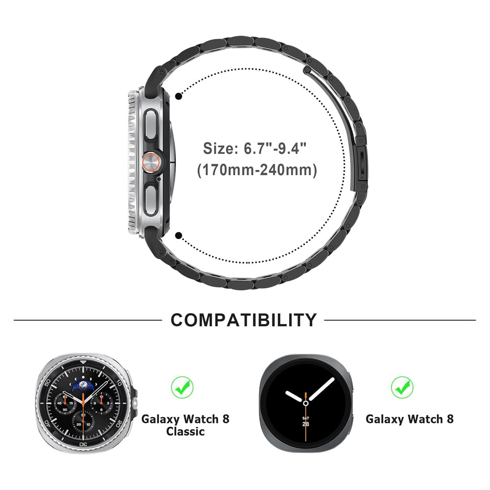 This metal replacement band is exclusively compatible with Samsung Galaxy Watch 8 (40mm and 44mm) and Samsung Galaxy Watch 8 Classic (46mm) – 2025 models.