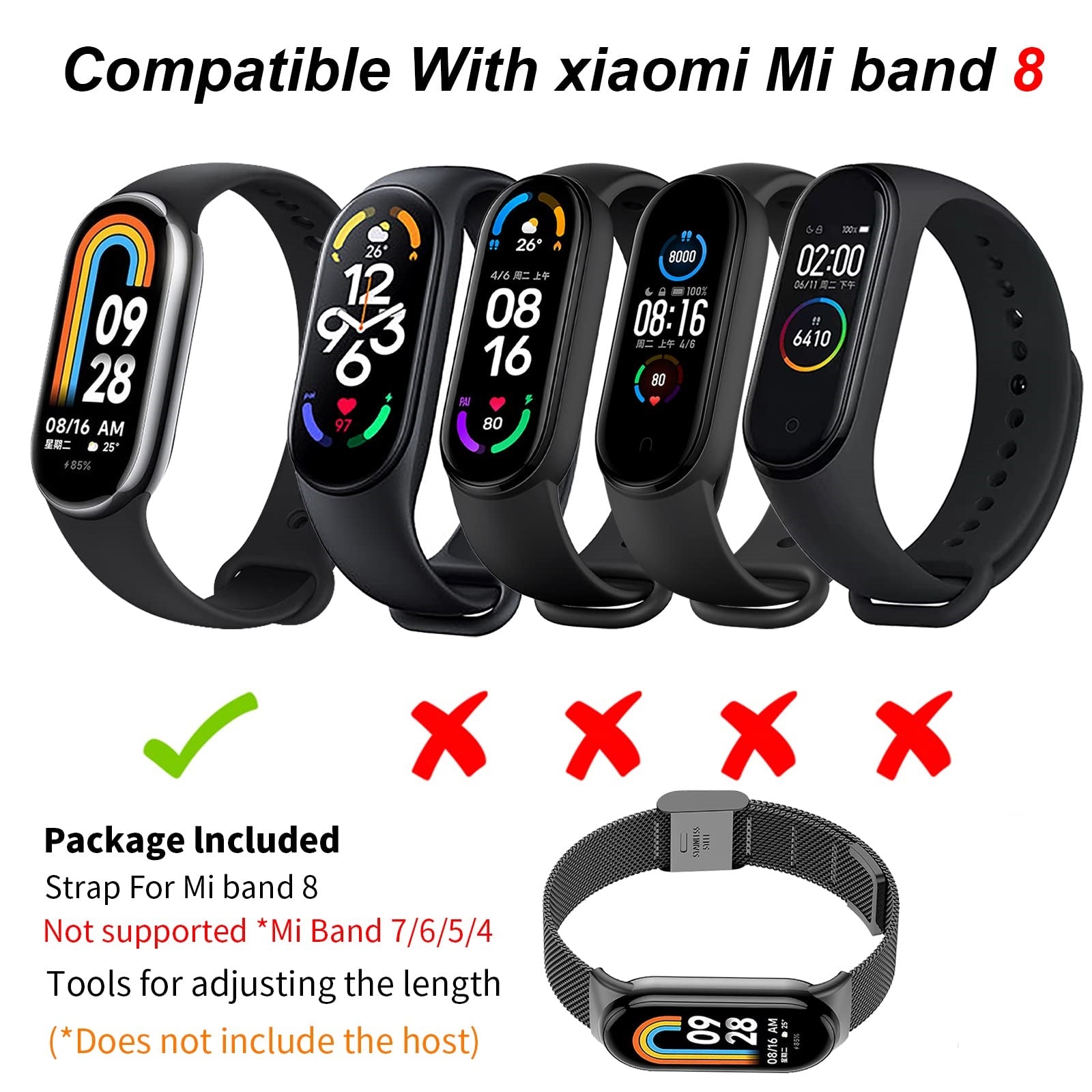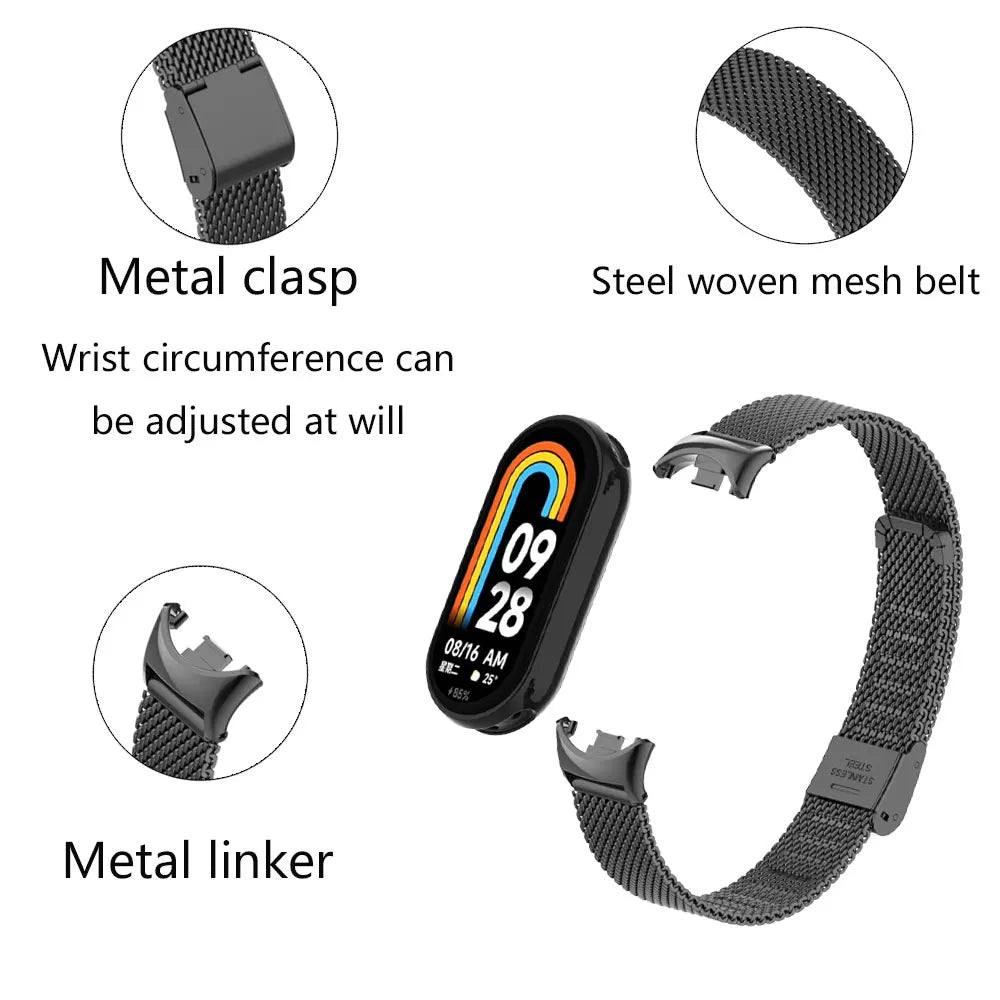 [Compatible Model] O Ozone Milanese Straps Compatible with Xiaomi Mi Band Band 9 / Band 8 smart accessories. Note: only includes Xiaomi Mi Band Band 9 / Band 8 wrist strap, not including smart band. [Premium Material]: O Ozone Slim Metal replacement strap for Mi Band 8 wristband made with premium stainless-steel material, beautiful, shiny, corrosion-resisting and durability, without any irritation to the skin. The refined plating process enhances the smoothness of the surface of the strap. [Premium Material]: O Ozone Slim Metal replacement strap for Mi Band 8 wristband made with premium stainless-steel material, beautiful, shiny, corrosion-resisting and durability, without any irritation to the skin. The refined plating process enhances the smoothness of the surface of the strap. [Unique Design]: Designing for ultimate comfort while providing a timeless, sleek fit and stylish look makes this an ideal iWatch strap replacement strap for you. Our narrow cute Milanese watch band is smooth, textured, breathable and classic, perfect as a delicate gift strap for women men. [Skin Friendly]: No Irritation to skin and bring you a comfortable wearing experience. Lightweight, holds your band securely in place. Perfect gift for anyone who is using the watch.