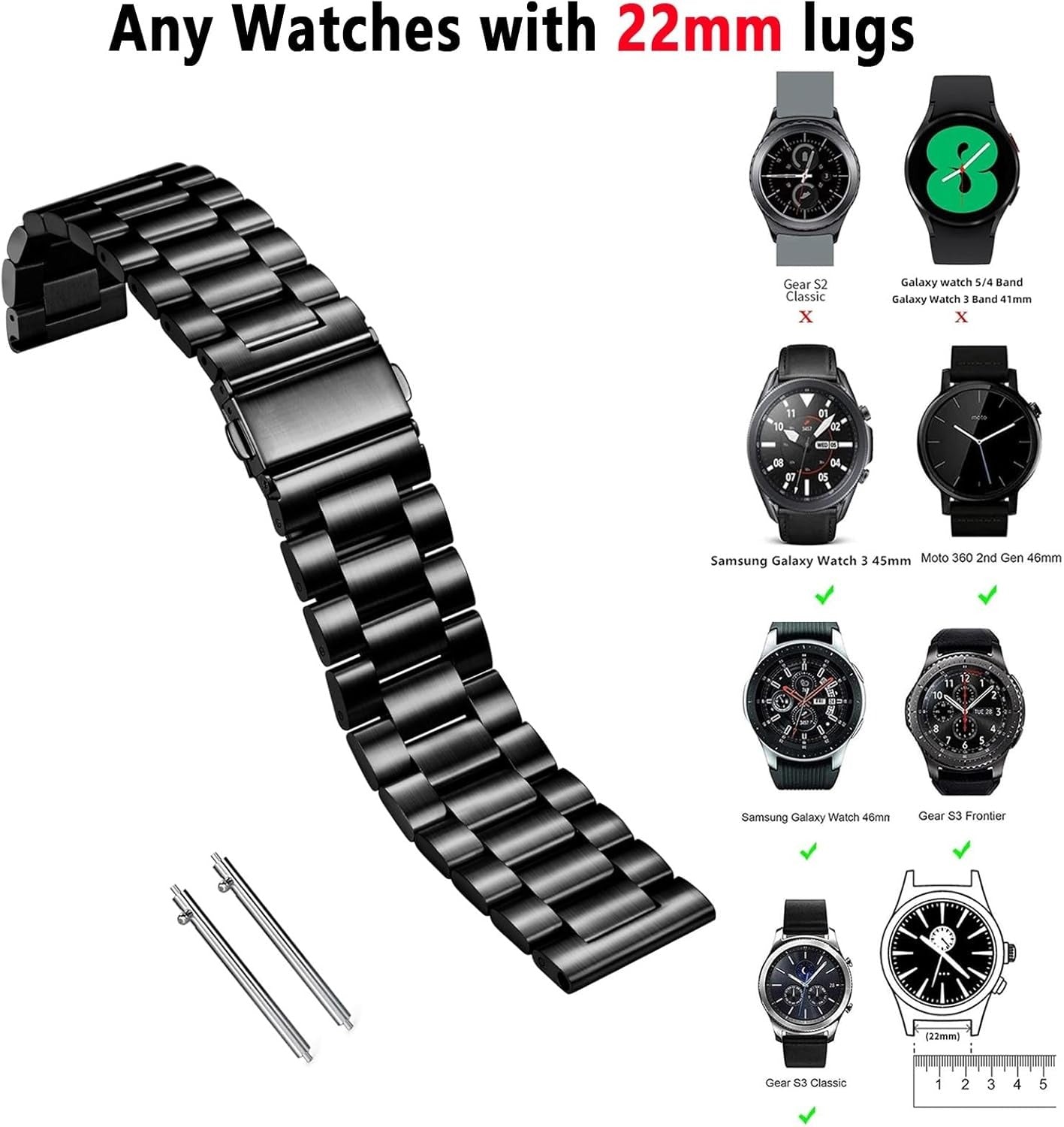 22mm Samsung Galaxy Watch Ultra LTE 47mm / Galaxy Watch 3 45mm Band| Metal Band | Black