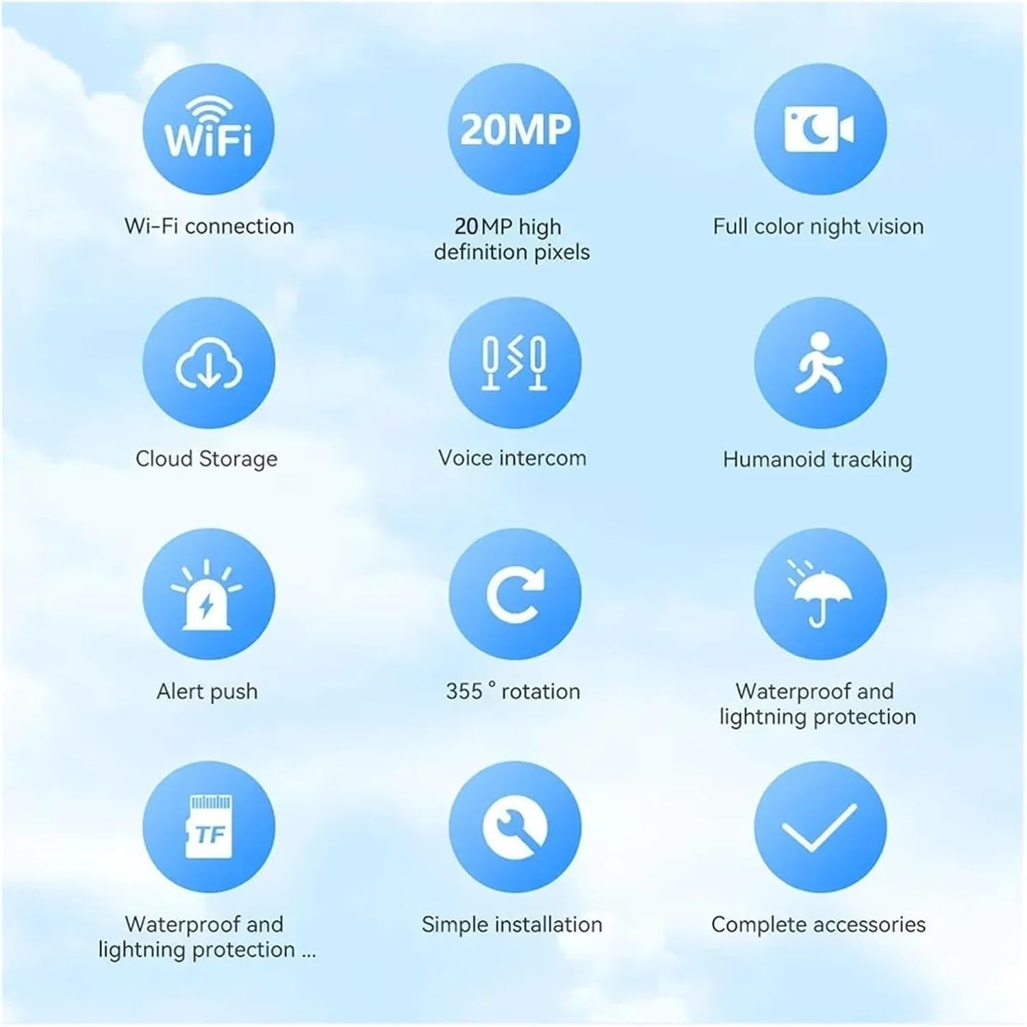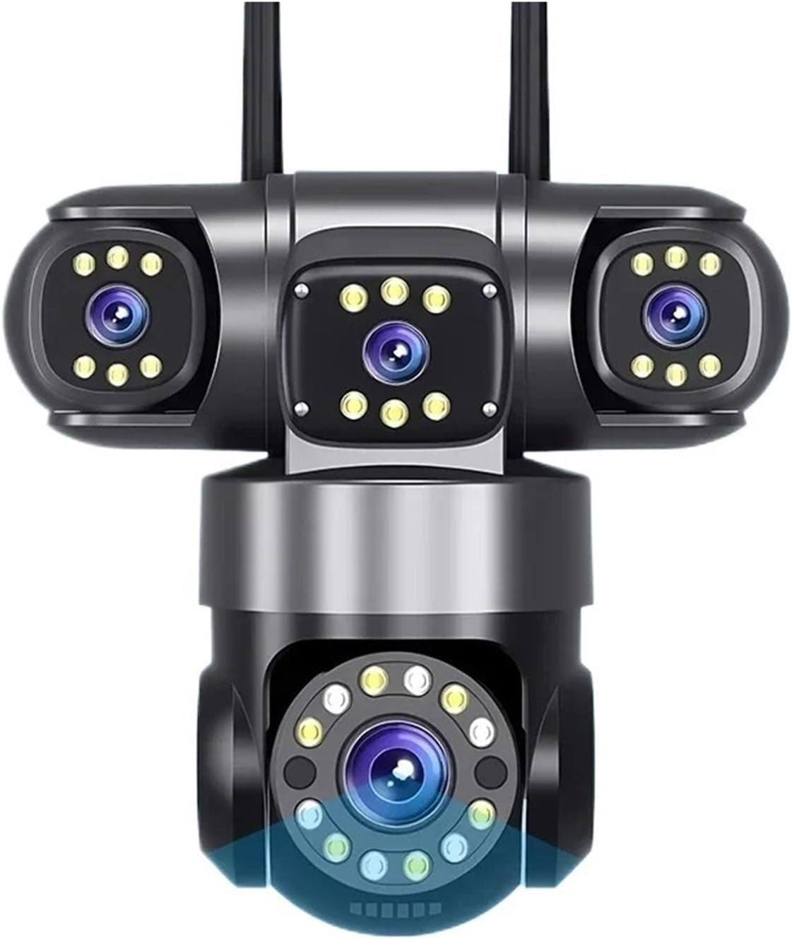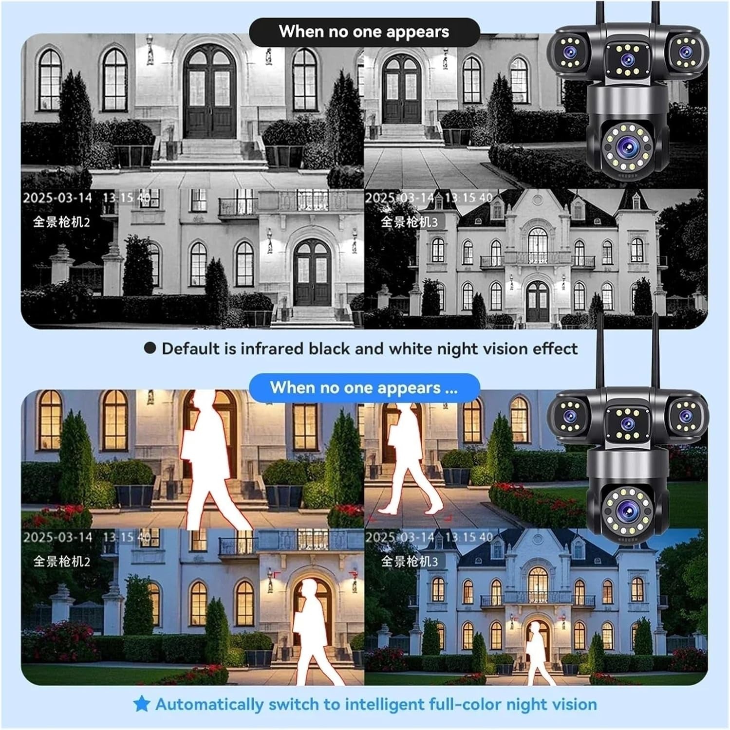 ? Four-Lens Panoramic Surveillance – No Detail Missed: Equipped with four 5MP lenses, this 4-lens security camera delivers simultaneous monitoring of four areas. Combined, it achieves 20MP ultra-HD clarity, covering courtyards, shops, and homes in 360° panoramic view. Real-time images are displayed separately with no overlap. ? AI Tracking & Multi-User Sharing – Efficient Protection: Built-in AI human/object detection automatically locks and follows movement. Abnormal activity is pushed instantly to multiple devices, allowing collaborative real-time monitoring by family members, shopkeepers, or security teams. ? 16x Zoom & 360° PTZ Control – Clear Near & Far: Digital 16x zoom lets you capture details up to 30–50 meters. With 360° horizontal rotation + 180° vertical tilt, this PTZ camera precisely locks and tracks distant vehicles, license plates, or high-up areas with a single click. ? Full-Color & Infrared Night Vision – Clear Low-Light Images: Switch freely between full-color night vision (white light) and infrared mode. Even at 0.001 Lux, the camera captures vivid color or sharp black-and-white video, ensuring nighttime security with no blurred shadows. ? IP66 Waterproof & Flexible Installation – Indoor/Outdoor Use: Military-grade protection ensures stable operation in rain, dust, and extreme temperatures (-10°C to 60°C). Supports wired + WiFi dual connection. Lightweight, durable design mounts quickly on walls or ceilings, ideal for homes, shops, and warehouses.