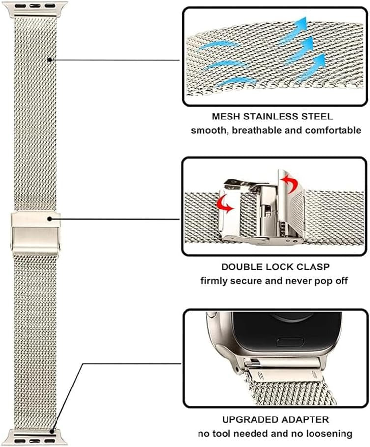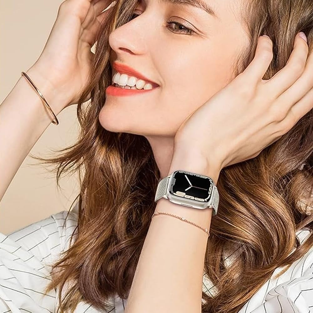 O Ozone Metal Band Compatible with Apple Watch – Milanese Stainless Steel Magnetic Loop Upgrade your Apple Watch with a sleek, modern, and durable metal band designed for all day comfort and timeless style. The O Ozone Stainless Steel Milanese Mesh Loop blends premium craftsmanship with a strong magnetic closure to deliver a secure and customizable fit for both men and women. Universal Compatibility Perfectly compatible with multiple Apple Watch sizes 38mm, 40mm, 41mm, 42mm, 44mm, 45mm, and 46mm, and works seamlessly with iWatch Series 11, 10, 9, 8, 7, 6, 5, 4, 3, 2, 1, and SE. Premium Stainless Steel Mesh Crafted from high quality 316L stainless steel, the Milanese mesh is smooth, breathable, and skin friendly. Its woven design keeps your wrist cool and comfortable, even during long hours of wear. Strong Magnetic Closure The upgraded magnetic clasp ensures a secure and adjustable fit with no buckles, no tools, and no hassle. The band wraps effortlessly around your wrist and stays locked in place all day. Stylish for Every Occasion Whether you are heading to work, the gym, or a night out, this elegant metal band complements any outfit. Its sleek finish makes your Apple Watch look refined and professional. Easy Installation The precise adapters allow quick, tool free installation. Slide the band in and out of your watch slots effortlessly. Durable and Rust Resistant Built to last, the stainless steel construction resists rust, fading, and daily wear, keeping your Apple Watch looking new for longer. Package Includes: 1 O Ozone Stainless Steel Milanese Mesh Loop Apple Watch Band