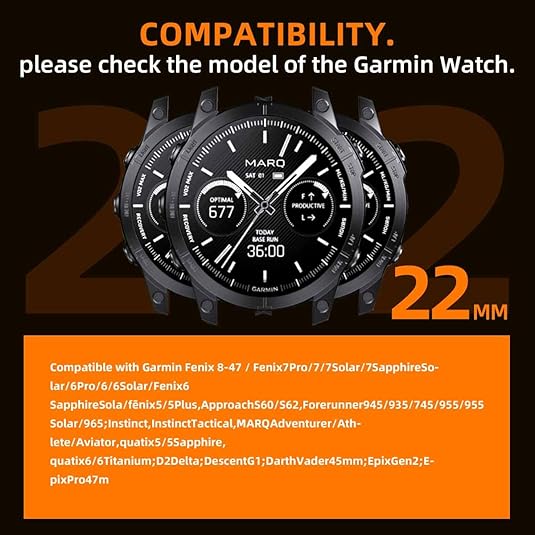 22mm QuickFit bands are compatible with Garmin Quatix 8 (47mm), Fenix 8 Pro/AMOLED (47mm), Fenix 7/7 Pro, Fenix 6/6 Pro, Fenix 5/5 Plus, tactix 8 AMOLED, Quatix 7/7 Pro/6/5, Forerunner 970/965/955/945/935, Approach S70 (47mm)/S62/S60, Descent G2/G1/G1 Solar, and MARQ Commander.