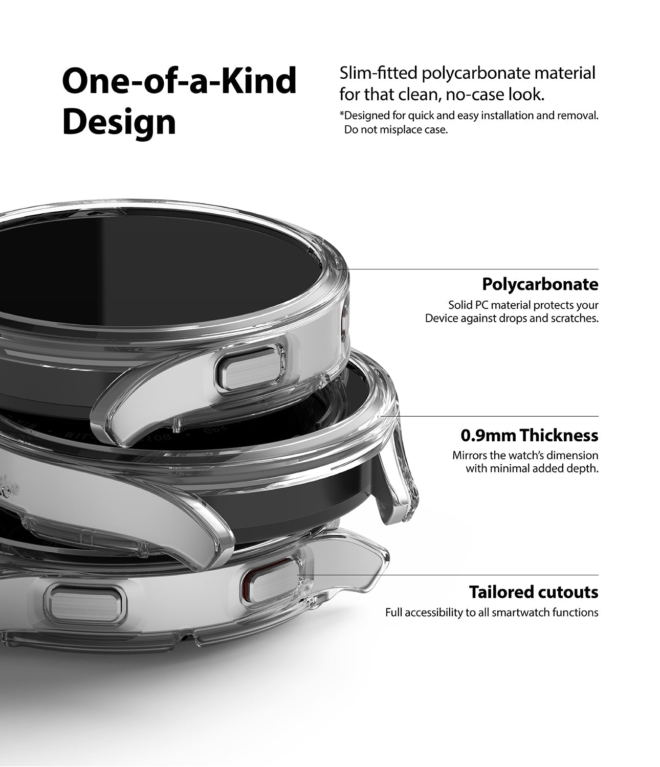 Make your Galaxy Watch last with the perfect case from Ringke.Ringke Slim is made from polycarbonate to remain lightweight and slim so you can enjoy all your regular activities without being weighed down by your accessory. The soft edges and smooth surface makes the case comfortable to wear and safe to use day-to-day while offering high-quality bumper protection.The solid design and craftsmanship pairs a sleek and refined finish to the Galaxy Watch's innovative construction for an eye-catching original style. It comes in various colors to best fit your style and personality to be the best all-inclusive smartwatch case for any gender and age.You can easily rotate the crown and press the power buttons without interruptions and when you're done for the day the open back lets your charge your device with the Galaxy charger as you commonly would.The open screen allows a complete view and usage of the touchscreen display while leaving enough room to fit a screen protector for added defense. No worries about discoloration or sweat retention after working out either!Insert the rotating crown into the bumper first and let the other side slide onto the rest of the watch for fast and smooth installation. Ringke Slim for the Galaxy Watch is designed to protect your smartwatch while keeping it running at 100% capacity. Mix-and-match your style by incorporating matching watch bands.