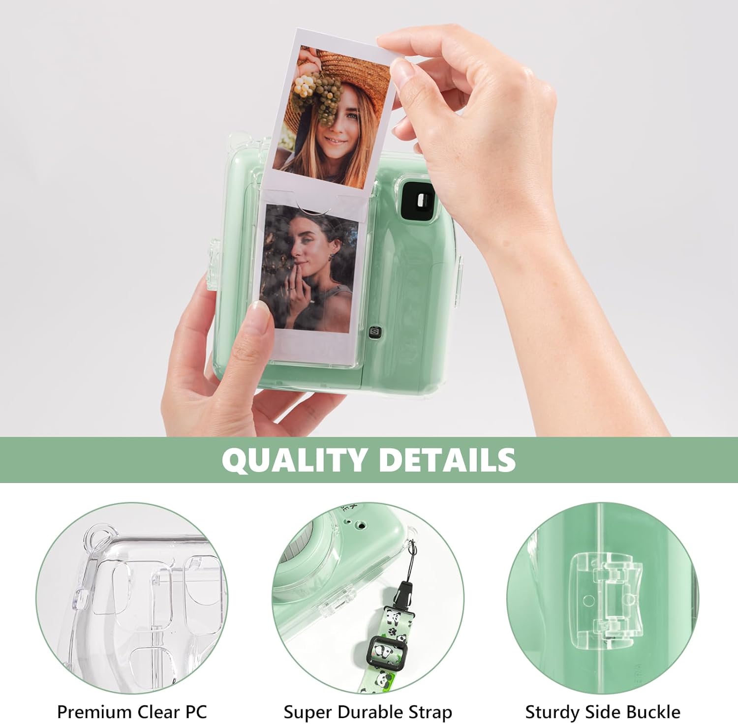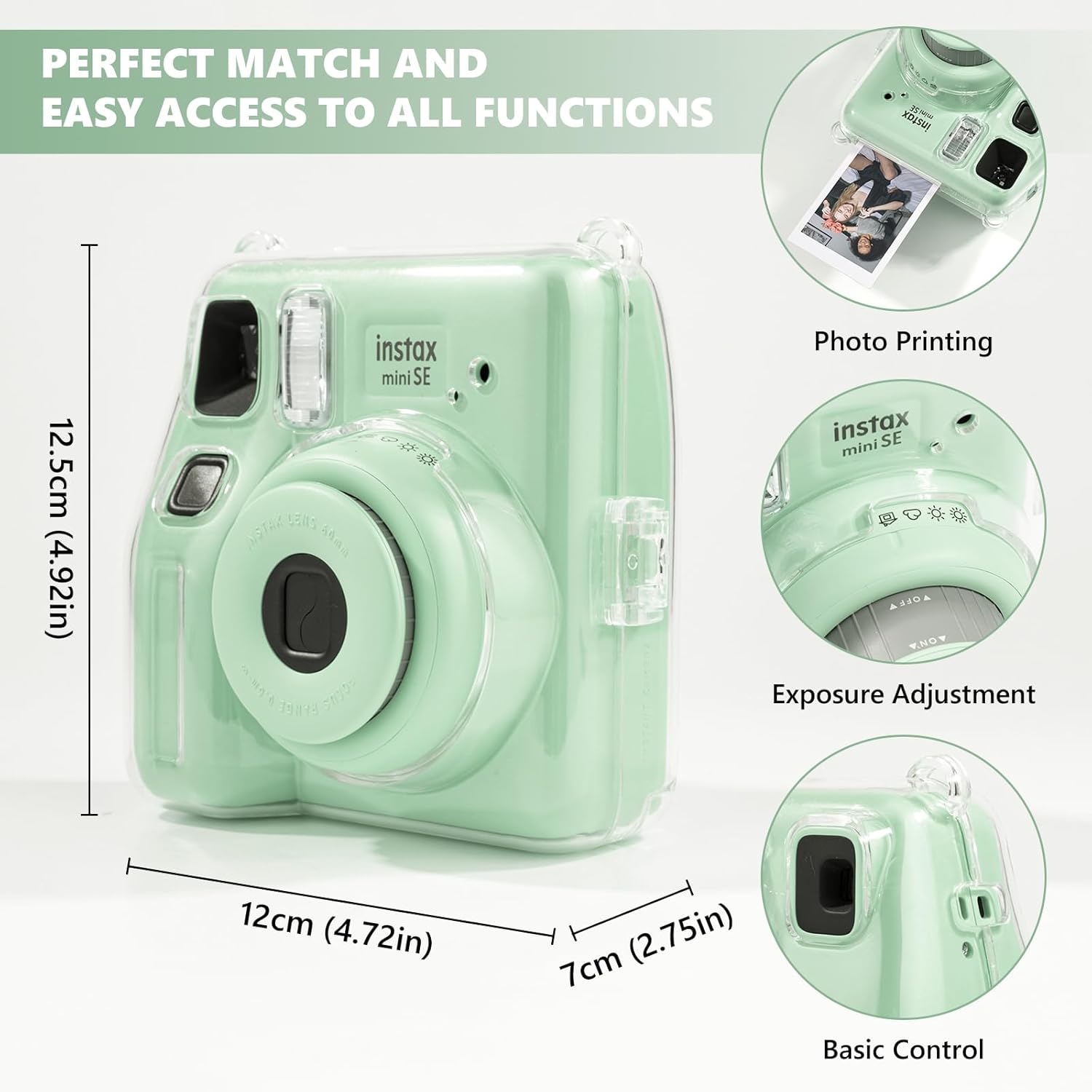 Clear Case for Fujifilm Instax Mini SE Instant Camera | Hard PC Cover with Film Pocket + Cute Sticker & Removable Strap | Green