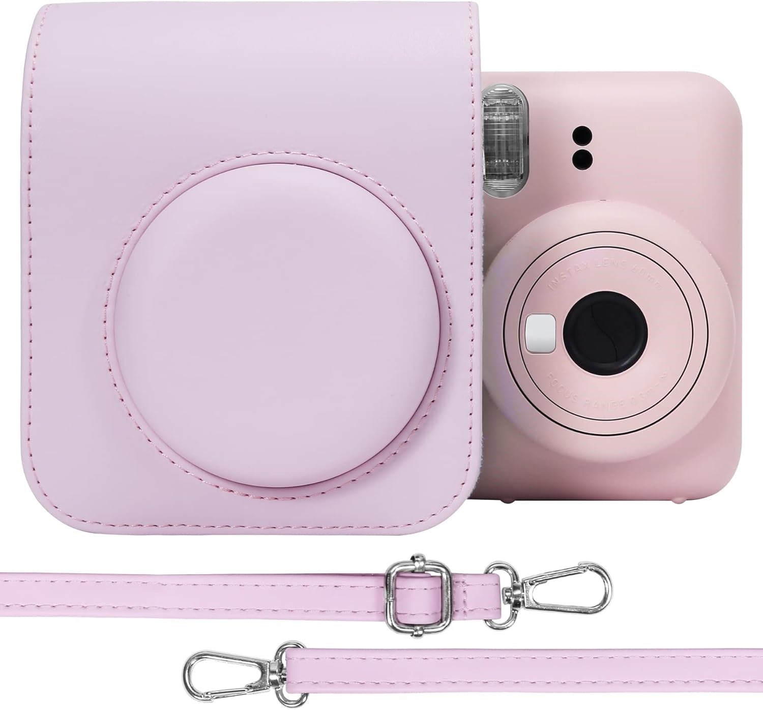 PU Leather Camera Case for Fujifilm Instax Mini 12 Instant Camera | Protective Cover with Adjustable Shoulder Strap | Blossom Pink