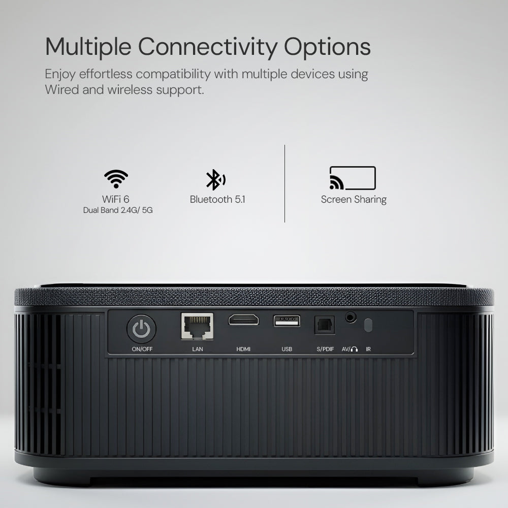 - ✅ WiFi 6 & Bluetooth 5.1 Connectivity for Wireless Freedom – Equipped with the latest WiFi 6 and Bluetooth 5.1 technology, this wireless projector for home and business use ensures smooth streaming and quick pairing with soundbars, speakers, or controllers. Enjoy lag-free mirroring via AirPlay and Miracast for Android and iOS devices.