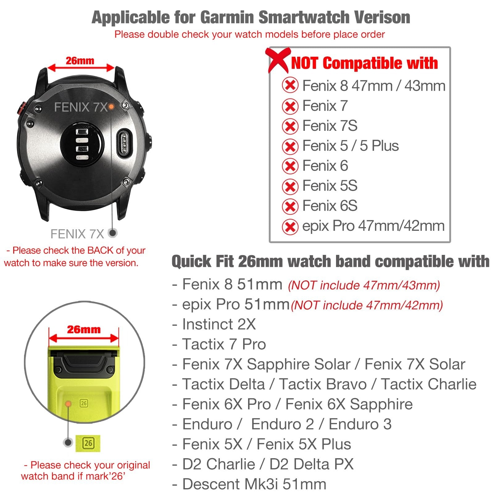 This replacement watch band is compatible with Garmin Fenix 8 51mm, Fenix 7X / 7X Pro, Fenix 6X / 6X Pro, Fenix 5X / 5X Plus, Fenix 3 / 3 HR, Instinct 2X, Epix Pro (Gen 2) 51mm, Enduro 3 / Enduro 2 / Enduro, Descent Mk3i 51mm, and Tactix 7 / 7 Pro. The precise 26mm Quick Fit design ensures a secure and reliable fit.